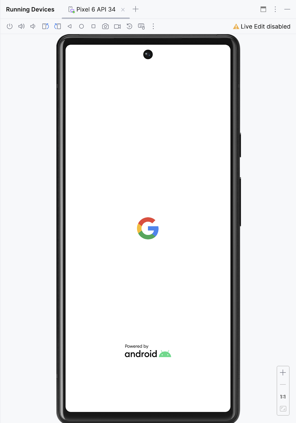 The virtual device starts just like a physical device. Expect this to take a while — potentially several minutes — when the emulator starts for the first time. The virtual device should open beside the code editor.