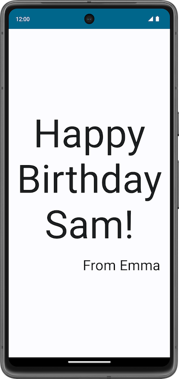 Textcomposable, add anotherTextcomposable that accepts atextargument set to thefromvalue.@Composable fun GreetingText(message: String, from: String, modifier: Modifier = Modifier) { Text( text = message, fontSize = 100.sp, lineHeight = 116.sp, ) Text( text = from ) }