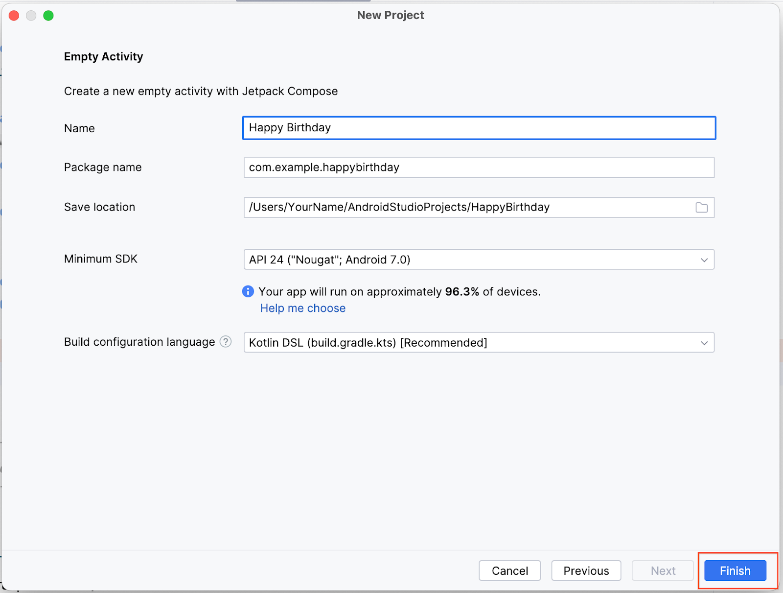 Happy Birthdayand then select a minimum API level of 24 (Nougat) in the Minimum SDK field and click Finish.