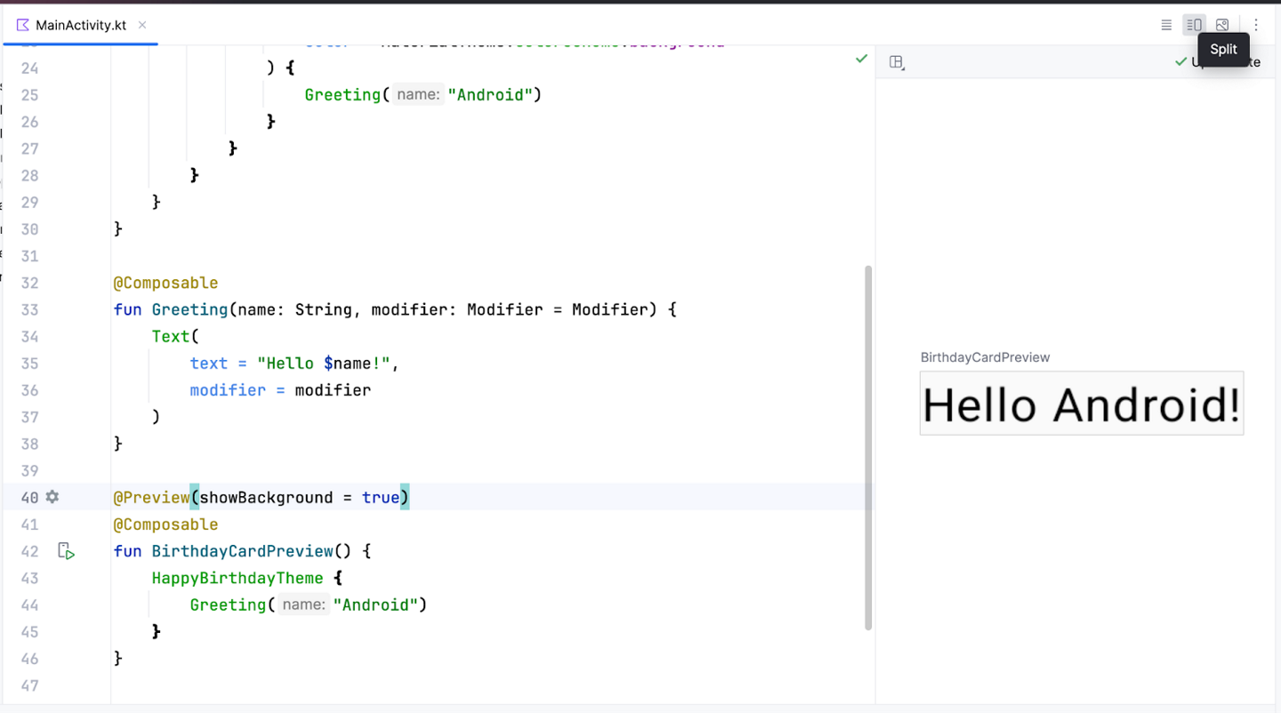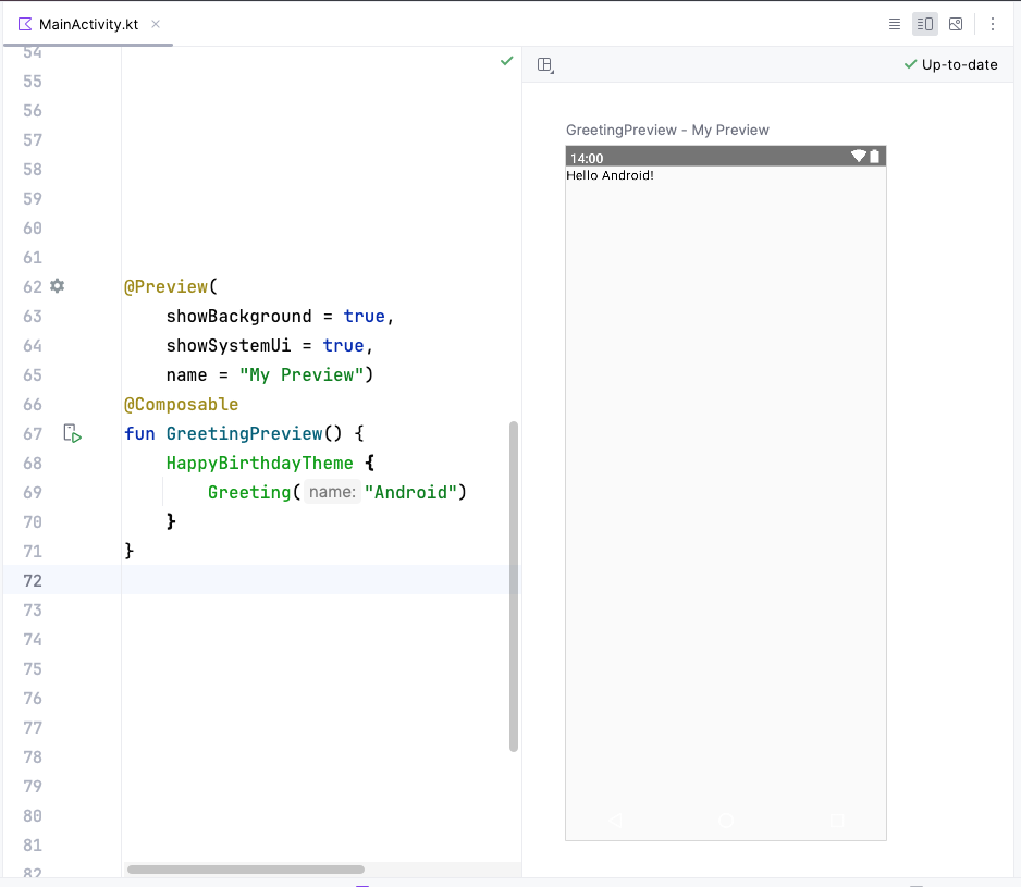Greeting()function call along with its arguments from theonCreate()andBirthdayCardPreview()functions. YourMainActivity.ktfile will look similar to this.Note