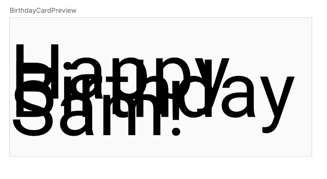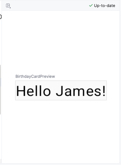 BirthdayCardPreview(), change the argument of theGreeting()function to your name.The preview should automatically update.