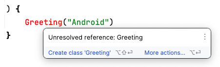 onCreate()(look forsuper.onCreate(savedInstanceState)), notice that theGreeting()function call is now colored red, indicating an error. Hover over the cursor over this function call and Android Studio will display information regarding the error.