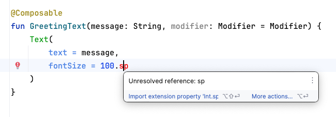 .spcode because you need to import some classes or properties to compile your app. Hover over (or click).sp, then click Import in the popup to import theandroidx.compose.ui.unit.spto use the.spextension property (more on extension properties later).