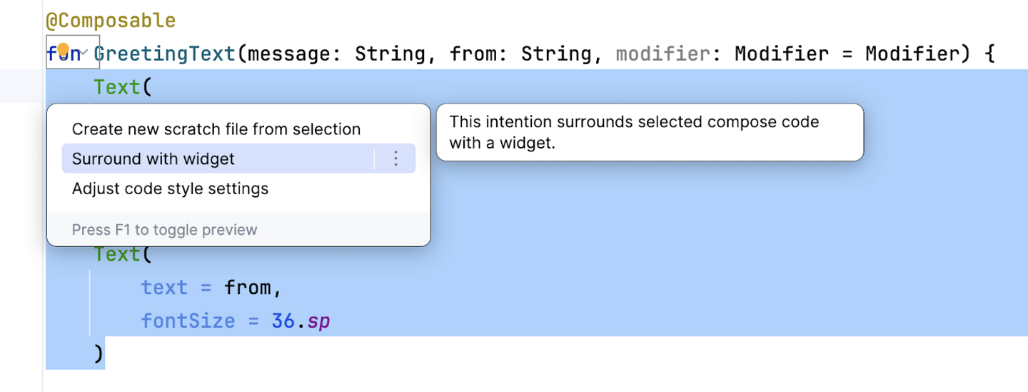 fromparameter of typeStringfor your signature.fun GreetingText(message: String, from: String, modifier: Modifier = Modifier)