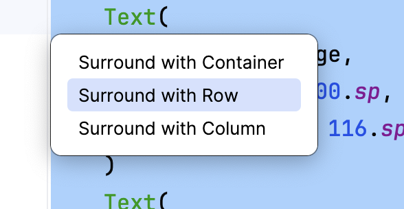 Rowcomposable around the text elements so that it shows a row with two text elements. Select the twoTextcomposables, click on the light bulb. Select Surround with widget > Surround with Row.