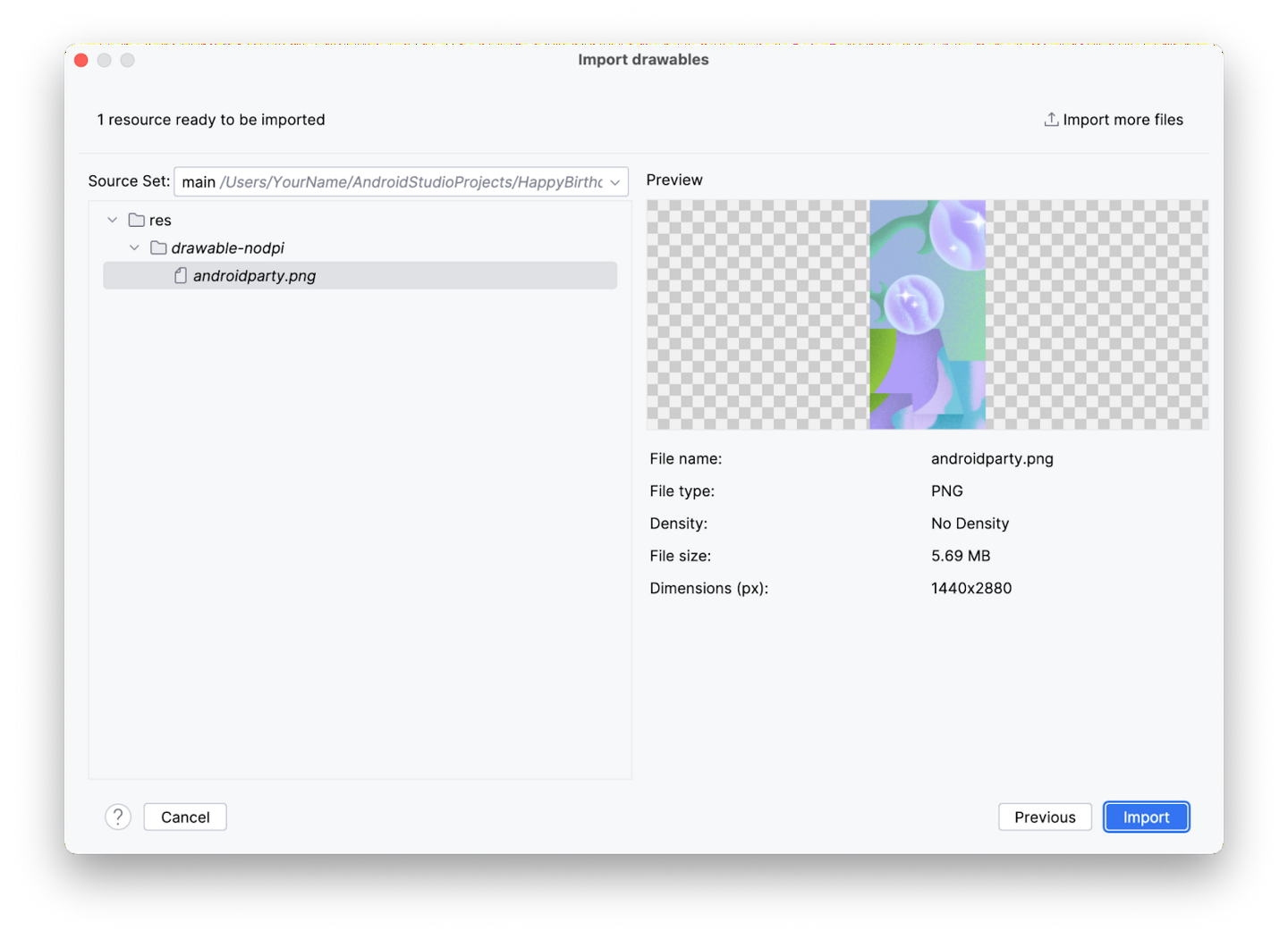 androidparty.pngfile, and click Open. This action opens the Import drawables dialog.
