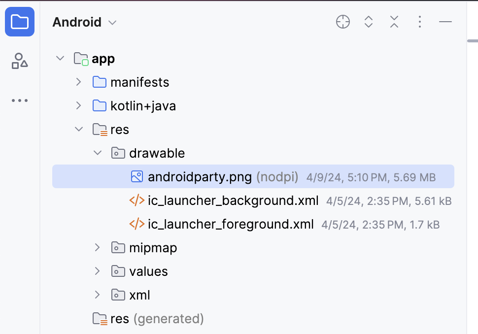 drawable-nodpifolder and places your image in it. In the Android Studio project view, the resource name is displayed asandroidparty.png (nodpi). In the computer file system, Android Studio would have created a folder calleddrawable-nodpi.