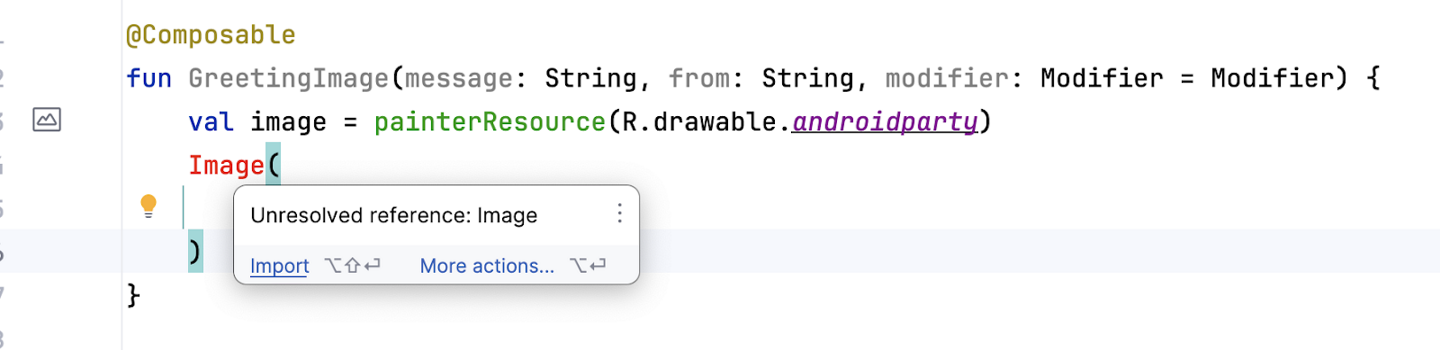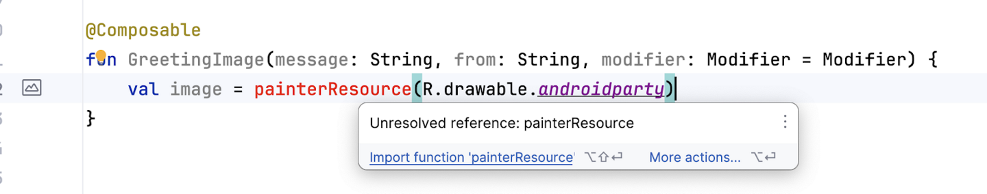 painterResource()function by passing in theandroidpartyresource. Assign the returned value to theimagevariable.val image = painterResource(R.drawable.androidparty)