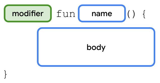 main()function in the previous codelab. For example, if you need to call theturnOff()method from theturnOn()method, you can write something similar to this code snippet:class SmartDevice { fun turnOn() { // A valid use case to call the turnOff() method could be to turn off the TV when available power doesn't meet the requirement. turnOff() ... } ... }