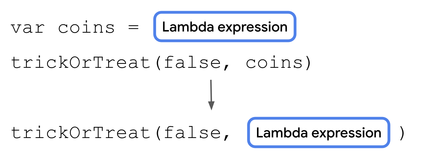 coins()function is currently only used in one place. What if you could simply pass a lambda expression directly into thetrickOrTreat()function without the need to first create a variable?Lambda expressions are simply function literals, just like