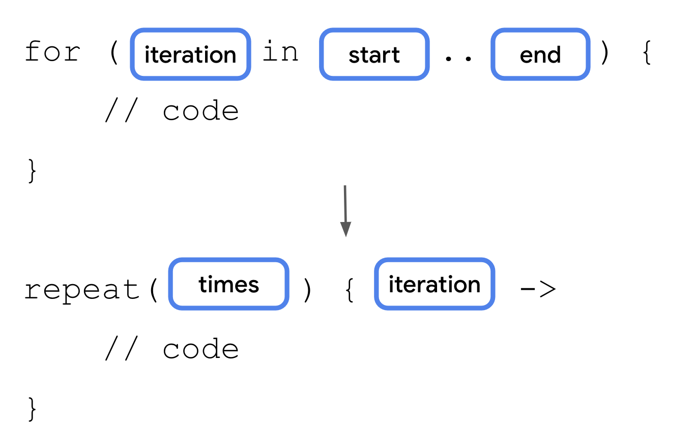 repeat()function is one such higher-order function. Therepeat()function is a concise way to express a for loop with functions. You use this and other higher-order functions frequently in later units. Therepeat()function has this function signature:repeat(times: Int, action: (Int) -> Unit)