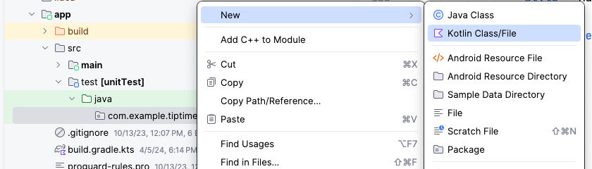 Right click the com.example.tiptime directory and then select New ➜ Kotlin Class/File.