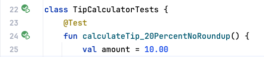 calculate_20_percent_tip()method and annotate it with the@Testannotation:import org.junit.Test @Test fun calculate_20_percent_tip() { }