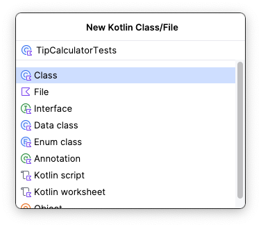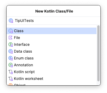 tiptimedirectory and then select New > Kotlin Class/File. EnterTipUITestsas the class name.