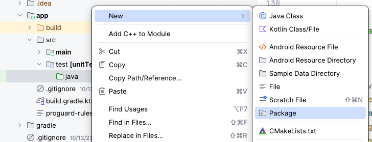 testdirectory requires a package structure identical to that of themaindirectory where your app code lives. In other words, just as your app code is written in themain/java/com/example/tiptimepackage, your local tests will be written intest/java/com/example/tiptime.Create this package structure in the test directory. Right click on the