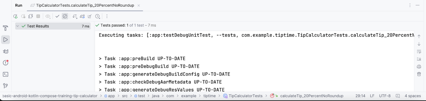 calculateTip()method works correctly, but thecalculateTip()method is currentlyprivateand thus not accessible from the test. InMainActivity.kt, remove theprivatedesignation and make itinternal:internal fun calculateTip(amount: Double, tipPercent: Double = 15.0, roundUp: Boolean): String { var tip = tipPercent / 100 * amount if (roundUp) { tip = kotlin.math.ceil(tip) } return NumberFormat.getCurrencyInstance().format(tip) }