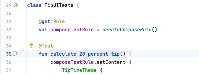 val composeTestRule = createComposeRule()and annotate it with@get:Rule:import androidx.compose.ui.test.junit4.createComposeRule import org.junit.Rule class TipUITests { @get:Rule val composeTestRule = createComposeRule() }