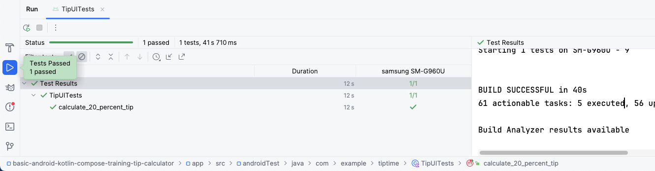 Click the arrows next to the class declaration. You can see the tests run on your device or emulator. When the test is finished, you should see: