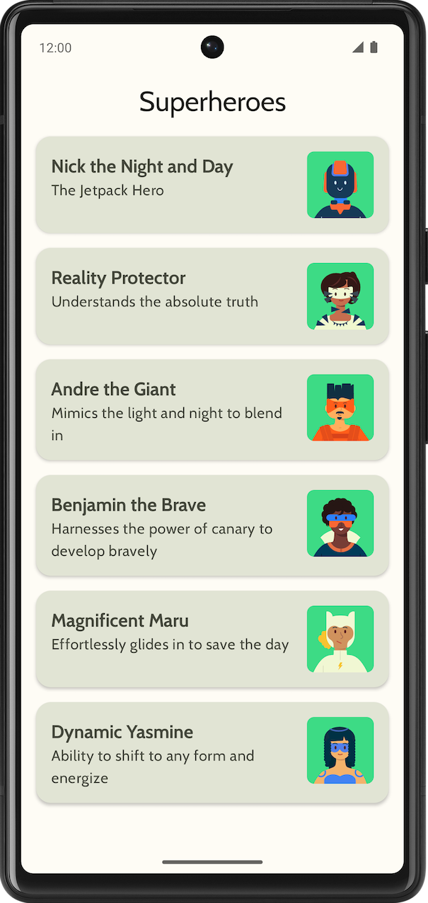 In this practice set, you’ll build on the concepts you learned in this pathway by creating a Superheroes app. This app focuses on creating the components necessary to build a scrollable list and a polished UI using the Material Design principles you learned in Material Theming with Jetpack Compose codelab.