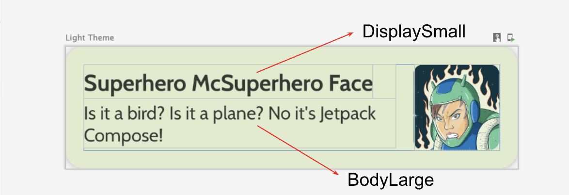 ui.theme/Type.ktimport androidx.compose.material3.Typography import androidx.compose.ui.text.TextStyle import androidx.compose.ui.text.font.Font import androidx.compose.ui.text.font.FontFamily import androidx.compose.ui.text.font.FontWeight import androidx.compose.ui.unit.sp import com.example.superheroes.R val Cabin = FontFamily( Font(R.font.cabin_regular, FontWeight.Normal), Font(R.font.cabin_bold, FontWeight.Bold) ) // Set of Material typography styles to start with val Typography = Typography( bodyLarge = TextStyle( fontFamily = Cabin, fontWeight = FontWeight.Normal, fontSize = 16.sp, lineHeight = 24.sp, letterSpacing = 0.5.sp ), displayLarge = TextStyle( fontFamily = Cabin, fontWeight = FontWeight.Normal, fontSize = 30.sp ), displayMedium = TextStyle( fontFamily = Cabin, fontWeight = FontWeight.Bold, fontSize = 20.sp ), displaySmall = TextStyle( fontFamily = Cabin, fontWeight = FontWeight.Bold, fontSize = 20.sp ) )