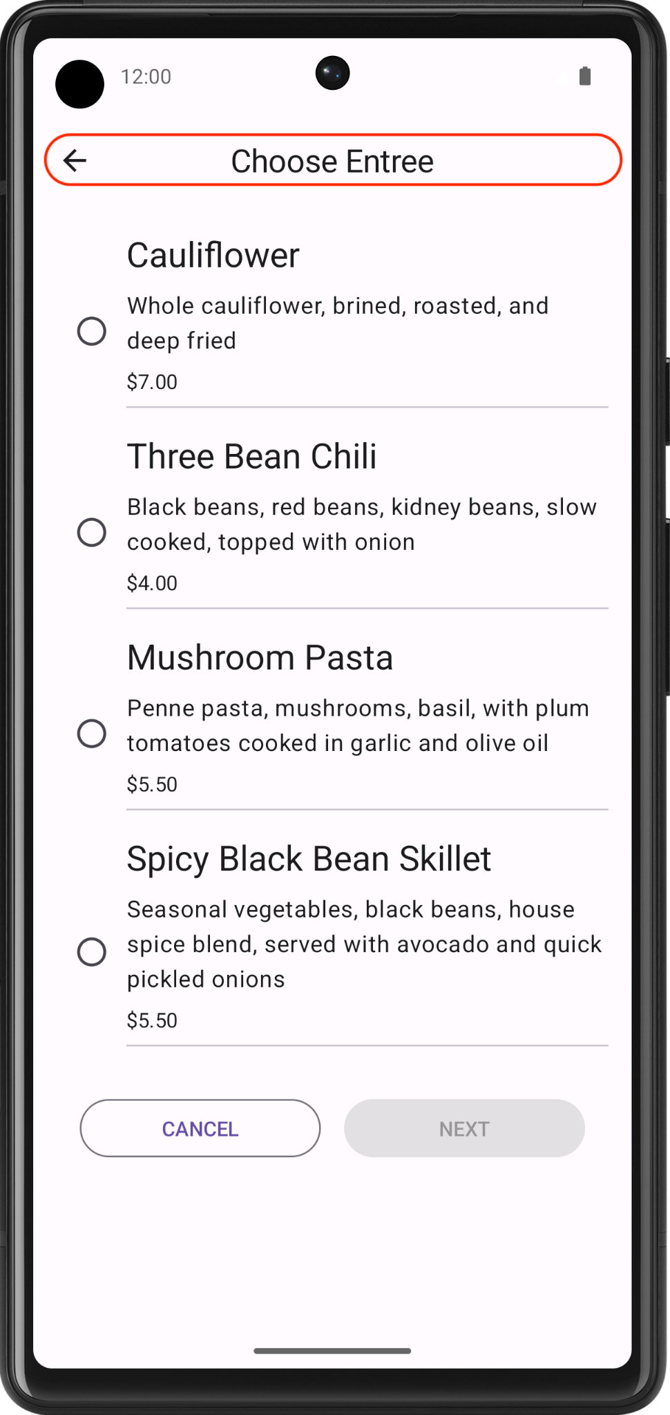 In these practice problems, you will complete the Lunch Tray app by adding navigation. The Lunch Tray app is an interactive lunch ordering app with three screens. Each screen represents one of the three types of menu items from which you can select: an entree, a side dish, and an accompaniment.