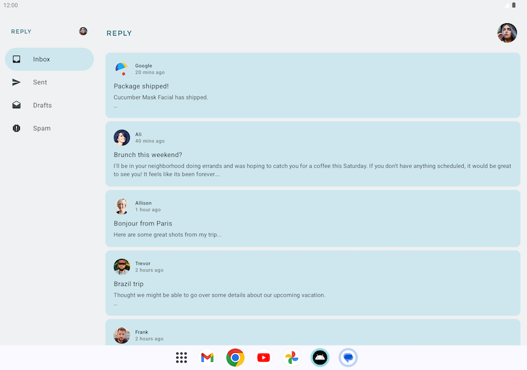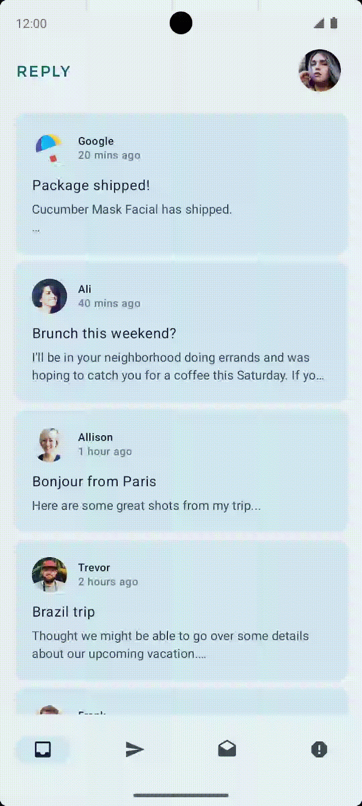 On larger screens, this navigation element is not ideal, because users can find it difficult to reach. Fortunately, there are recommended patterns for different navigation elements for various window size classes in navigation for responsive UIs. The Reply app uses these: