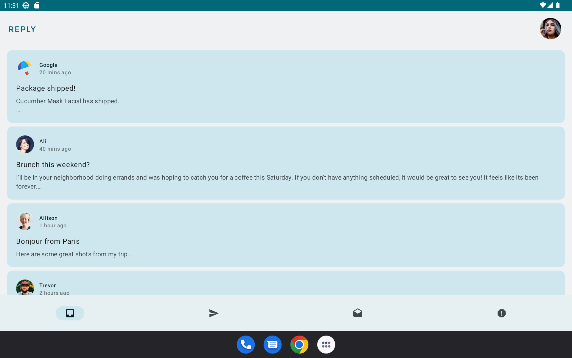 As you see in the Reply app, design for large screens is not just stretching or enlarging UI elements to fit the screen. It is an opportunity to use the increased real estate to create a different experience for your users. For example, you can add another layout on the same screen to prevent the need to navigate to another screen or make multitasking possible.