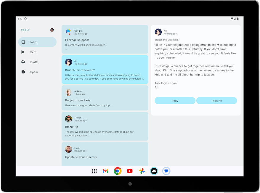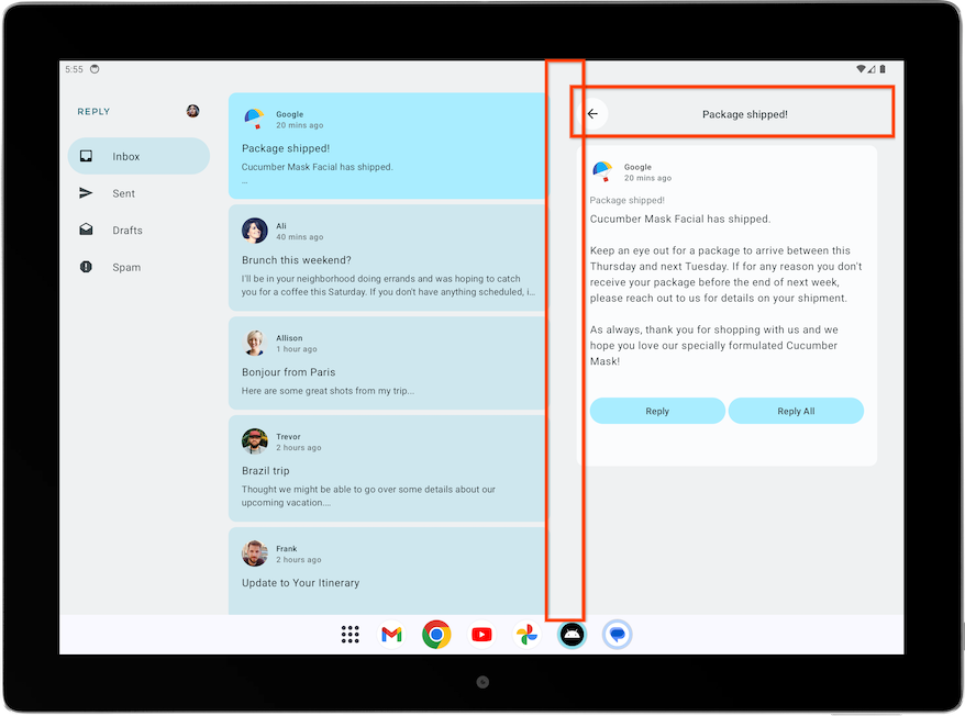 For the Reply app, the list-detail view is best for browsing content and quickly seeing details. With a list-detail view layout, there’ll be another pane next to the email list screen to display the email details. This layout allows you to use the available screen to show more information to the user.
