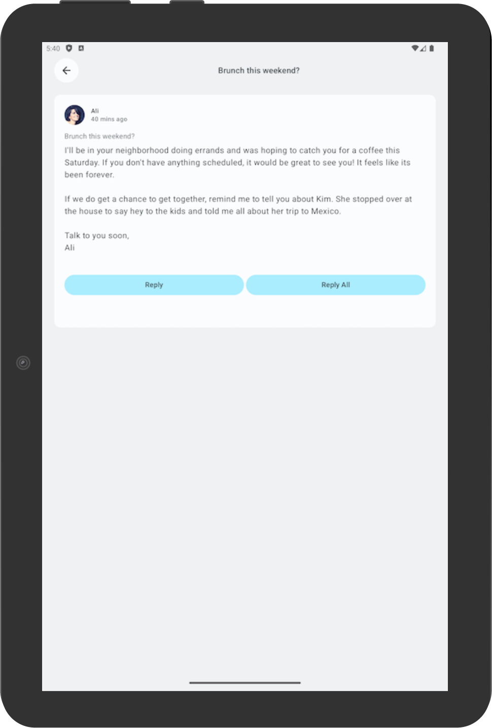 Rotate the device to check that the selected email is still consistent with the email selected in portrait orientation. In this example, an email from Ali is still shown.