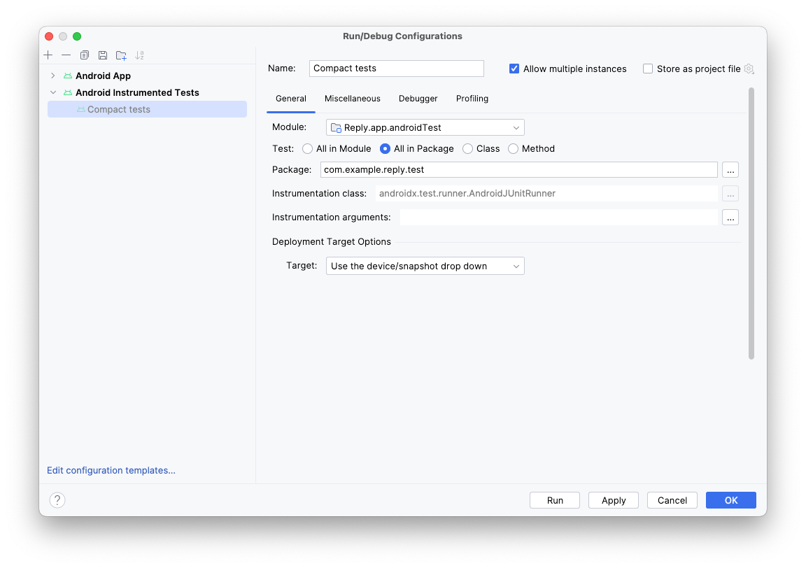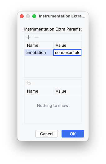 Click the plus (+) button and add the extra parameters: annotation with the value com.example.reply.test.TestCompactWidth.