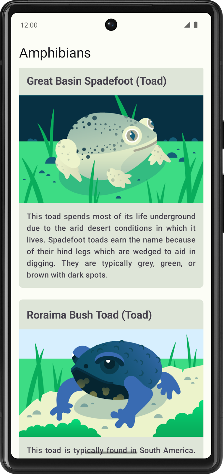 In this practice set, you will build an app to display a list of amphibians, along with their details and image. The data is retrieved from the internet by making a network request and contains each amphibian’s name, type, description, and image URL.