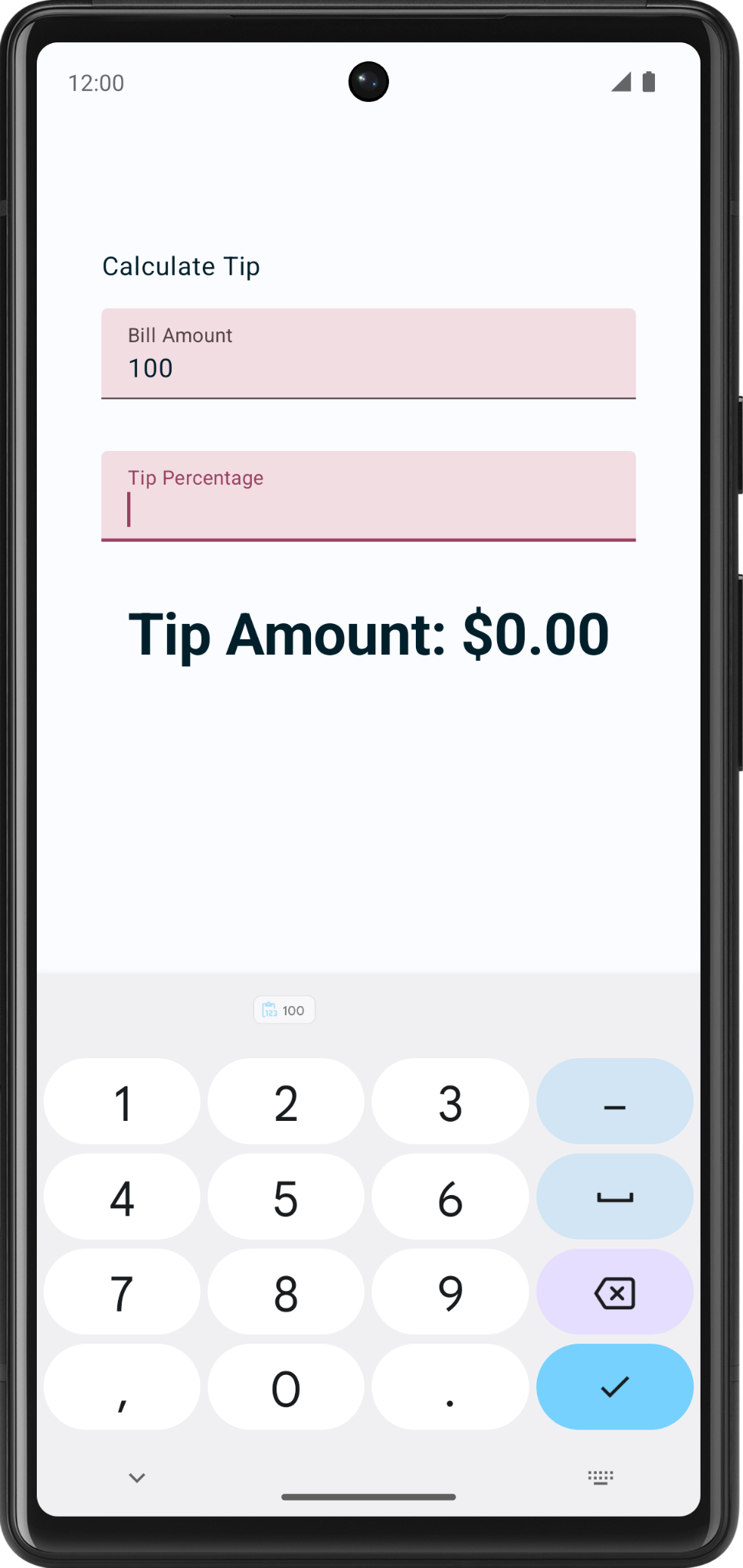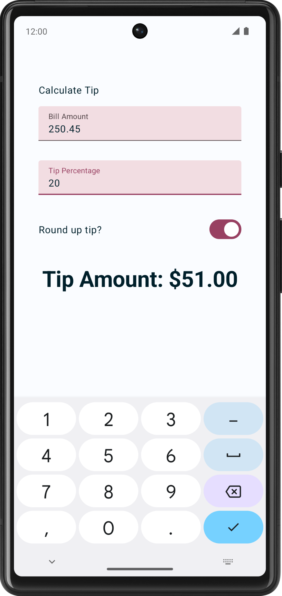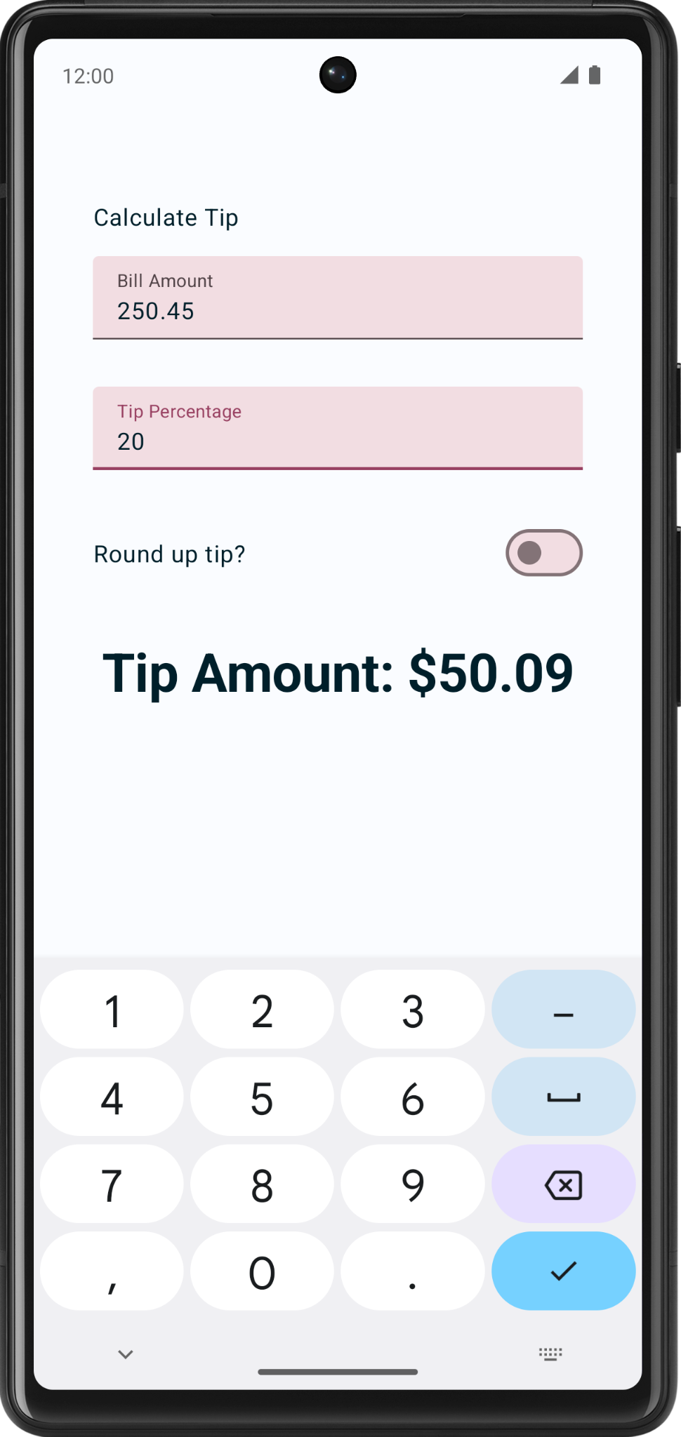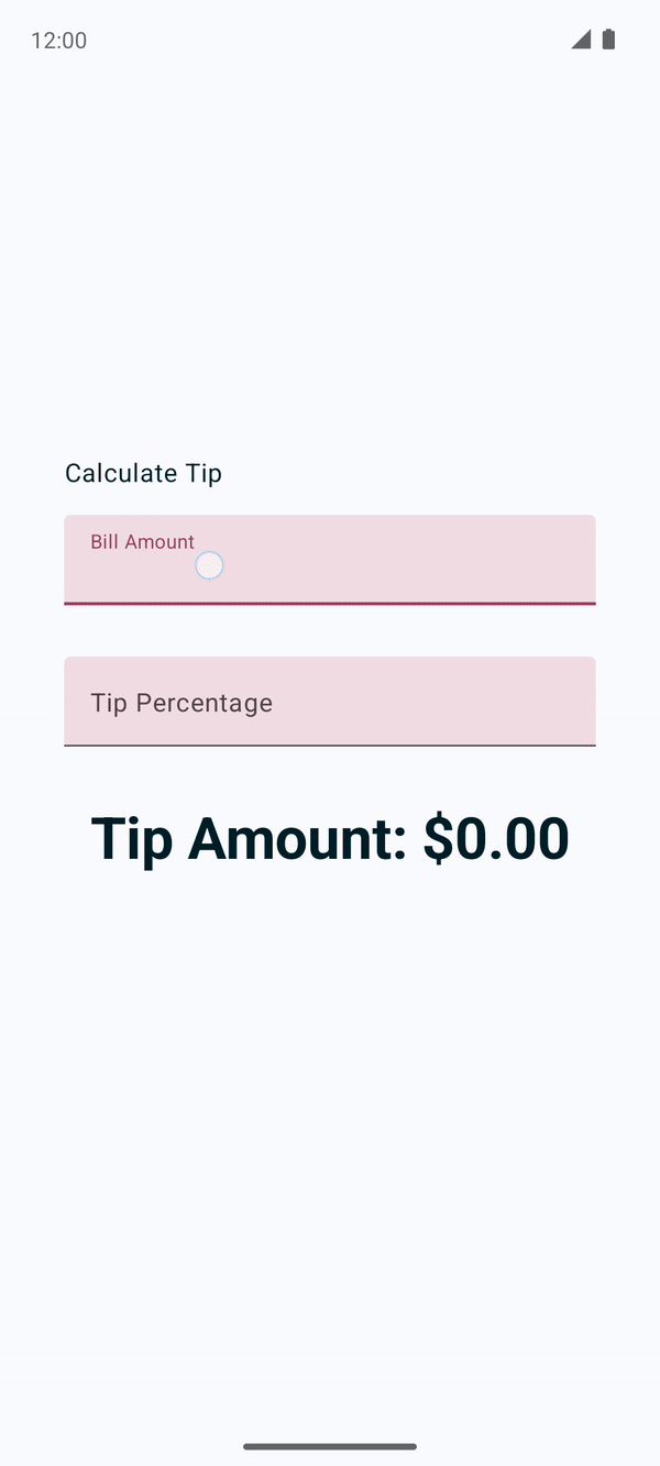 TipTimeLayout()composable contains the state, and the UI elements: text composables, number fields, etc.@Composable fun TipTimeLayout() { var amountInput by remember { mutableStateOf("") } var tipInput by remember { mutableStateOf("") } var roundUp by remember { mutableStateOf(false) } val amount = amountInput.toDoubleOrNull() ?: 0.0 val tipPercent = tipInput.toDoubleOrNull() ?: 0.0 val tip = calculateTip(amount, tipPercent, roundUp) Column( modifier = Modifier .statusBarsPadding() .padding(horizontal = 40.dp) .verticalScroll(rememberScrollState()) .safeDrawingPadding(), horizontalAlignment = Alignment.CenterHorizontally, verticalArrangement = Arrangement.Center ) { Text( text = stringResource(R.string.calculate_tip), modifier = Modifier .padding(bottom = 16.dp, top = 40.dp) .align(alignment = Alignment.Start) ) EditNumberField( label = R.string.bill_amount, leadingIcon = R.drawable.money, keyboardOptions = KeyboardOptions.Default.copy( keyboardType = KeyboardType.Number, imeAction = ImeAction.Next ), value = amountInput, onValueChanged = { amountInput = it }, modifier = Modifier.padding(bottom = 32.dp).fillMaxWidth(), ) EditNumberField( label = R.string.how_was_the_service, leadingIcon = R.drawable.percent, keyboardOptions = KeyboardOptions.Default.copy( keyboardType = KeyboardType.Number, imeAction = ImeAction.Done ), value = tipInput, onValueChanged = { tipInput = it }, modifier = Modifier.padding(bottom = 32.dp).fillMaxWidth(), ) RoundTheTipRow( roundUp = roundUp, onRoundUpChanged = { roundUp = it }, modifier = Modifier.padding(bottom = 32.dp) ) Text( text = stringResource(R.string.tip_amount, tip), style = MaterialTheme.typography.displaySmall ) Spacer(modifier = Modifier.height(150.dp)) } }