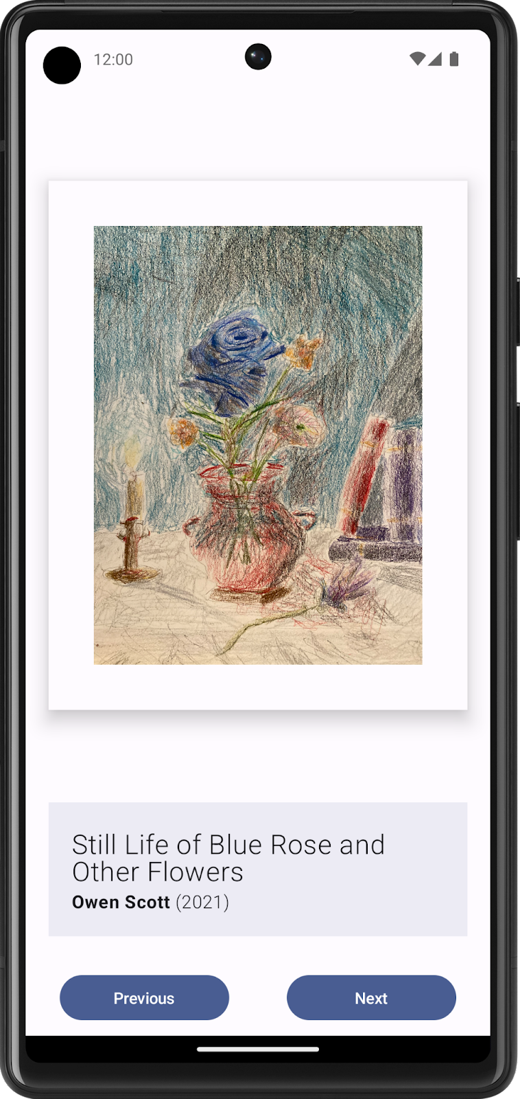 Artwork image * Information about the artwork, such as its title, artist, and year of publication * Any other elements, such as buttons that make the app interactive and dynamic.